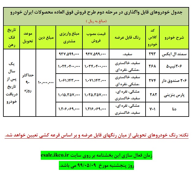 جدول فروش فوق العاده ایران خودرو